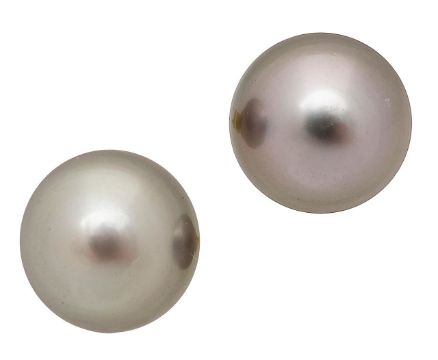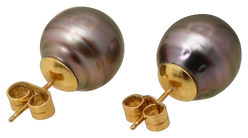 A pair of grey Tahitian cultured pearl ear studseach with a diameter of 11.2mm - 11.4 mmtotal approx. weight 4.8g Condition: In good overall condition and with even lustre. Grey (one slightly darker than the other) with pink or green overtones.Slightly ridged and a few pits near base by post.