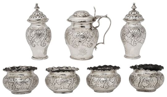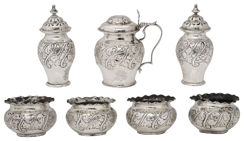 embossed with scrolling acanthus leaf decoration, comprising a mustard pot with hinged domed cover and blue glass liner, a pair of pepper pots and four cauldron salts with crimped rims and gilt interiors, engraved with a monogram (7)