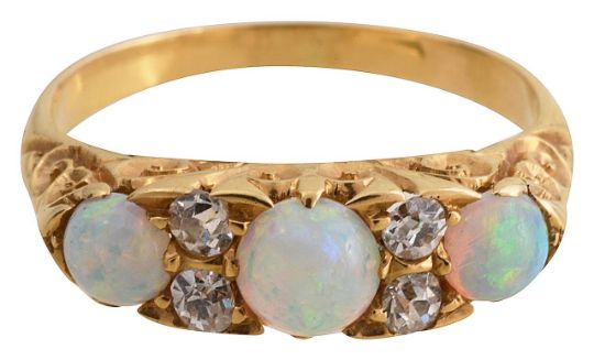 An opal and diamond-set ringthe three slightly graduated circular opal cabochons each separated by two old-cut diamonds to the pierced scrolling galleryring size H, 2.3gCondition: Overall condition good/very good.opals well matched - good play of colour