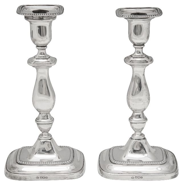 of rectangular form with knopped baluster stems fitted with detachable drip pans with gadrooned rims and borders, on spreading weighted rectangular bases, initialled A.T. and dated 1st May 1934, (3)