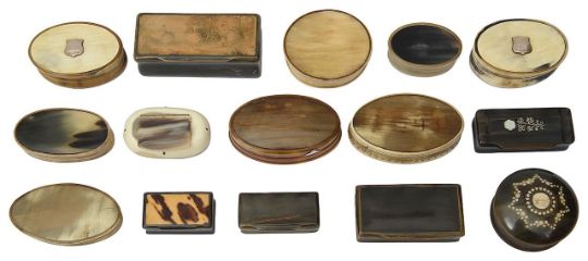 to include two Scottish ovoid examples with applied silver shield shaped reserves to the covers, by William Dunningham & Co Aberdeen, c.1900 other probably Scottish oval shaped boxes, a rectangular horn and tortoiseshell snuff box, another inlaid with a mother of pearl flower pique work flower, a round box inlaid with bone and pique work,