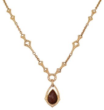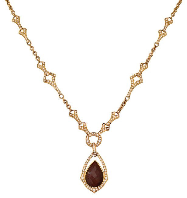 A rock crystal and diamond-set pendant and 18ct yellow gold necklace by Stephen Websterfrom the 'Crystal Haze' collection, the detachable pendant continuing a faceted ovoid rock crystal with a brownish-red closed engraved backing, stamped '18, SW, and maker's logo' to the diamond-set border and suspensory loop, suspended from the 18ct yellow gold belcher link chain necklace with shaped diamond-set spacers at intervals, with triangular plaque stamped '18K, SW and maker's logo', London hallmark pendant length with loop 4.0cm, width 2.2cm, 10.6g; necklace length 54cm, 30.6gCondition: Overall condition very good. A very well made piece.