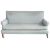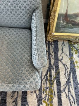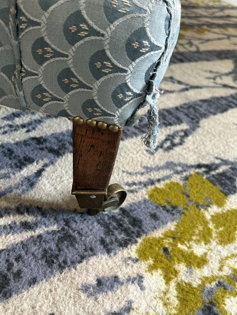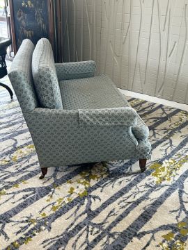 rectangular back, single loose cushion seat and back, raised on square tapering legs and brass casters, covered in blue patterned fabric