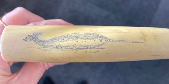 the ivory handle engraved with a narwhal, half spiral twist carved wood shaft with horn ferrule
