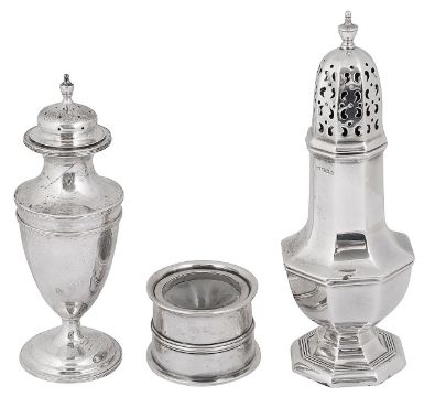 first London, 1909, Goldsmiths & Silversmiths Co., Ltd, of urn form with reeded borders, second Sheffield, 1924, Walker & Hall, of octagonal baluster form, together with a silver mounted glass inkwell, Chester, 1901, James Deakin & Sons