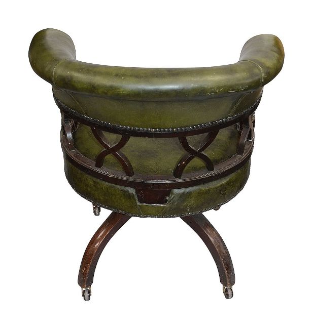 An Edwardian mahogany and leather tub shaped swivel desk chair
