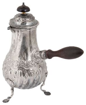 of half gadrooned baluster form with foliate cased decoration and vacant reserve, with hinged domed cover, ebonised wooden finial and turned side handle, on shell feet