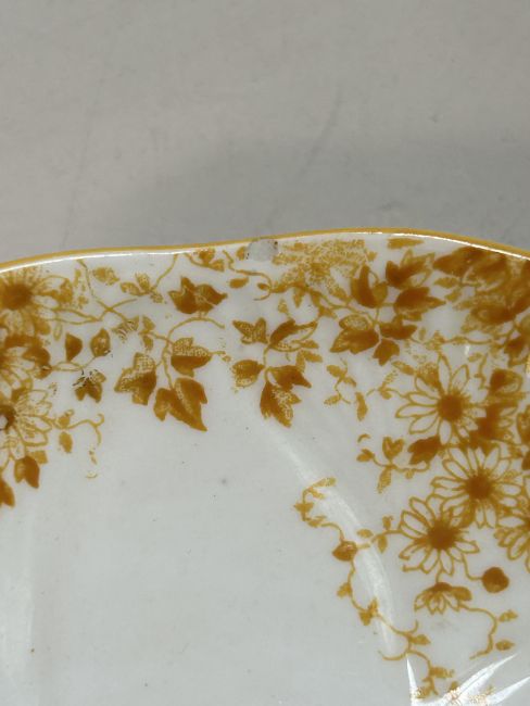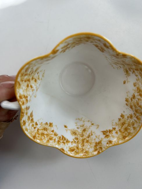 Condition: Dainty yellow teacup hairlined. small chip to dainty yellow saucer Other pieces in good condition