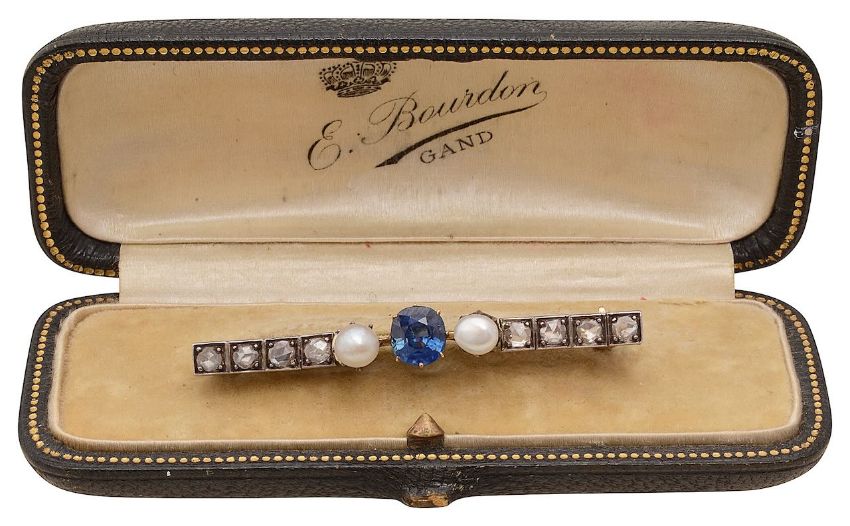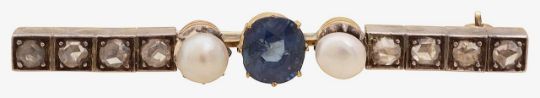 the central oval mixed-cut sapphire with a pearl (untested) and four rose-cut diamonds to each side, mounted in silver and yellow gold, fitted gilt tooled and leather case