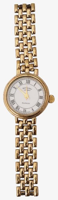 circular white dial, with Roman numerals, minute track, signed Rotary, Quartz movement, flexible 9ct gold brick-link bracelet, stamped with hallmarks, with safety chain