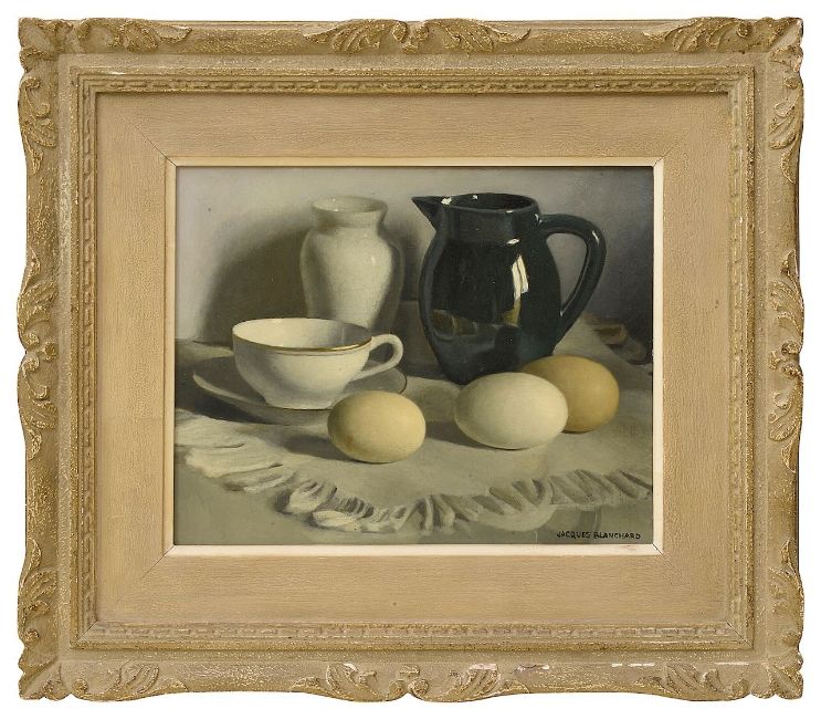 "A still life of eggs, a teacup and saucer and a milk jug" oil on board, signed lower right "Jacques Blanchard", framed
