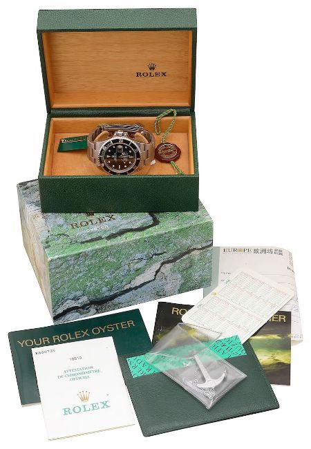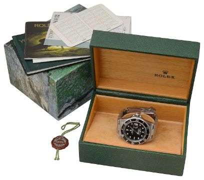 Model number 16610, serial number K800735 black dial, luminous dot markers, baton quarters, Mercedes hands with luminous inserts, centre seconds, magnified date aperture, case brushed and tonneau form with screw down back, oyster link steel strap, clasp numbered 93250, together with leather Rolex box and outer card case, purchase receipt from 2002, shop tag, Rolex tag, paper guarantee, papers and Rolex submariner anchor