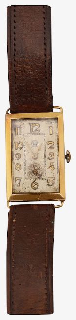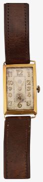 An 18K Roskoff gentleman's wristwatchthe rectangular dial with Arabic numerals, case marked 18K on the reverse, manual wind, leather strapdiameter of case approx 22mm., gross weight approx. 15.9gCondition: Movement not tested or guaranteed. Very worn. Dial worn and with rust marks and in poor condition. Requires overhaul.