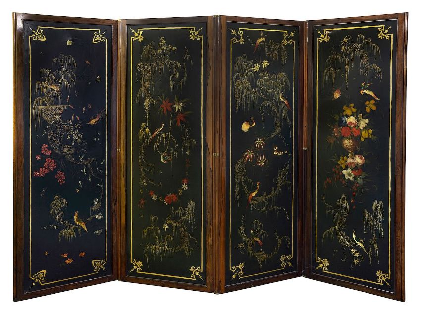 An early Victorian rosewood framed four fold room screen in the manner of Jennens and Bettridge