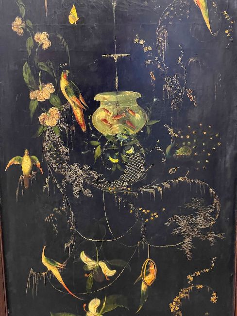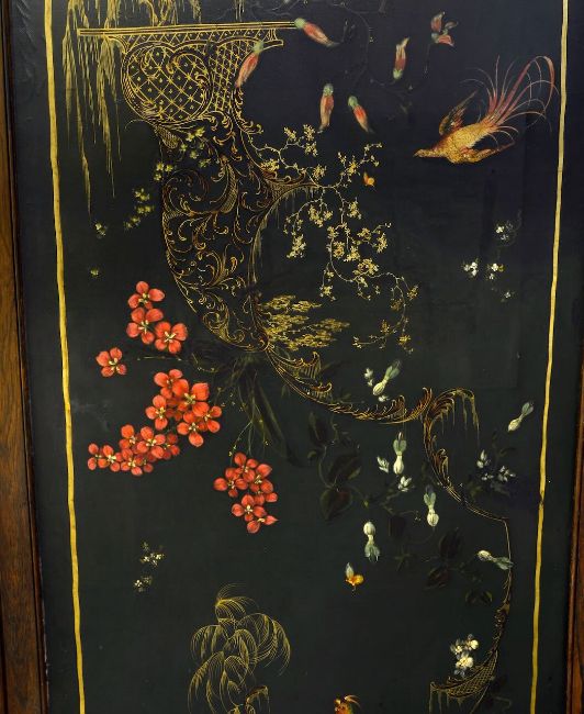 Condition: A decorative piece. Frame sound but repolished Repairs with good restoration canvas panels to both sides. The black ground side appears period with surface cracking, craquelure, old repairs, stretcher marks and restoration. The green ground side appears fresher, brighter, cleaner and flatter. The canvas also has a different weave to the black ground side. It is possible that these panels are not period, however there are repairs and with restoration so they may be old replacements decorated in similar style been restored and heavily cleaned.