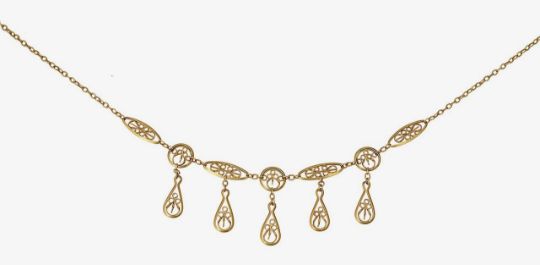 the centre section comprising circular and oval wire-work motifs, suspending five open wire-work drops, to the trace-link back chain