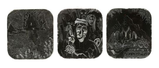 depicting 'Batu caves K.L', a mountainous landscape with buildings and a Noh theatre scene, etched on Pacific 24-Hour Ration aluminium tin lids, of which two signed T Kawai and one titled, mounted framed, (3)