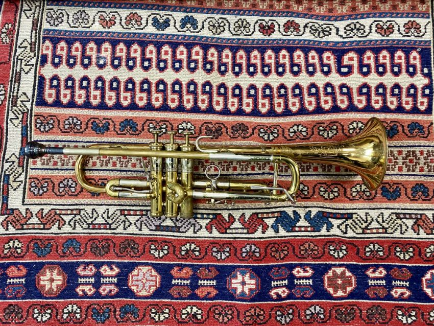 nickel-silver outer slide tubes, mother of pearl finger button inserts, plated mouthpiece, numbered 296895 in a fitted case
