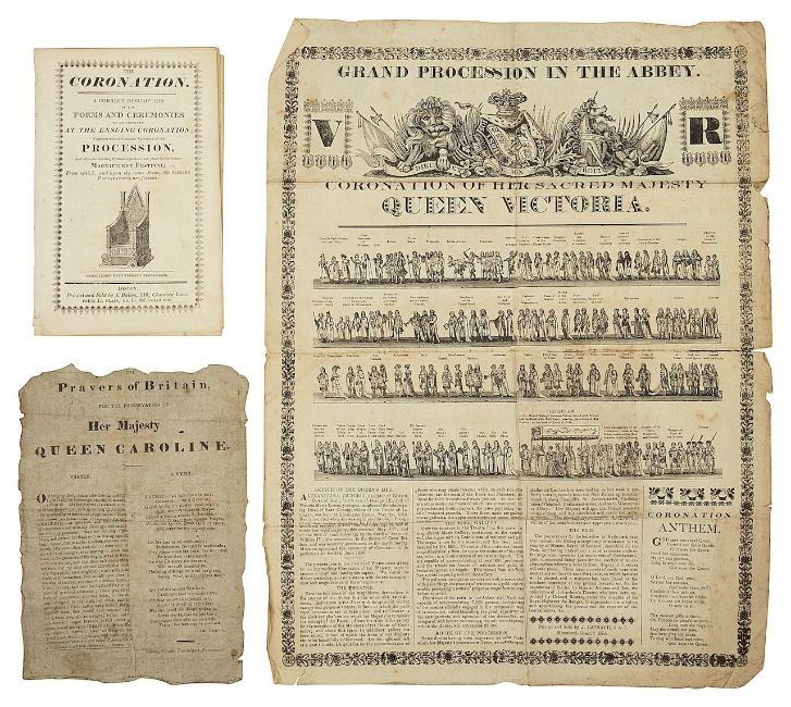 first The Coronation. A correct description of the Forms and Ceremonies to be observed at the ensuing coronation together with a concise account of the Procession, London c. 1820, 12mo., printed by J. Bailey, folding woodcut plate of the procession with hand colouring, pp. 24., 'A Grand Procession in the Abbey Coronation of her Sacred Majesty Queen Victoria' with wood cut illustration of the procession, printed and Sold by J. Catnach, and another broadside 'The Prayers of Britain, for the preservation of Her Majesty Queen Caroline, (3)