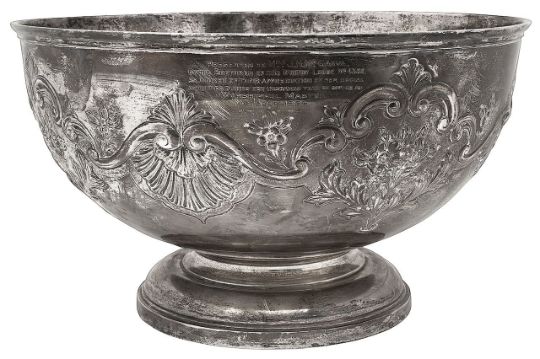 embossed with scrolls, shells and foliate decoration, on a domed spreading foot, engraved with emblem for Whitby Lodge No 4309 and presentation inscription dated 1924