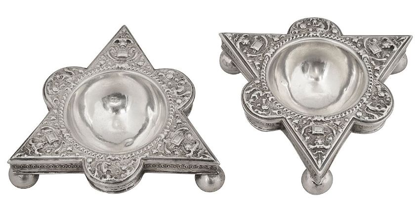 first Sheffield, 1882, Charles Favell, of triangular shaped form with embossed decoration and central circular wells on ball feet, (2)