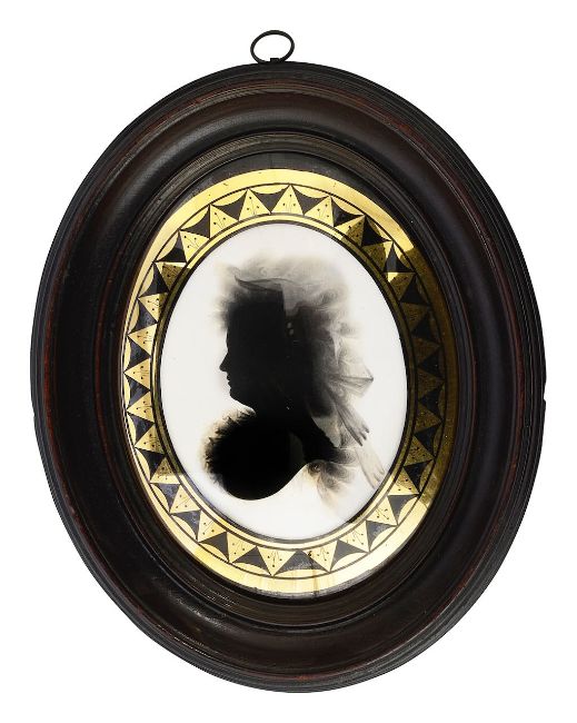 bust length, gentleman facing right wearing a pig tail wig tied with a ribbon, coat and frilled cravat, the lady facing left, wearing a dress with frilled collar and ribbon tied veil over here hair, painted on white plaster, oval, convex glass with verre eglomise border, ebonsied moulded oval pearwood frames, bear printed paper trade labels verso 'John Miers (late of Leeds) no 162 opposite the New Church, Stand, London, 99, (2)