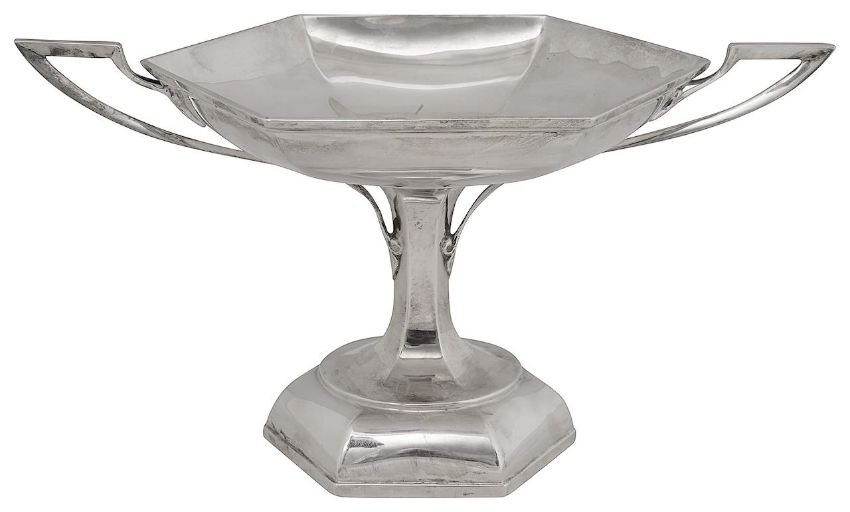 of hexagonal shallow form with sinuous whiplash handles, raised on a domed pedestal foot