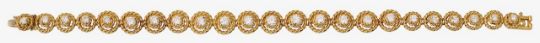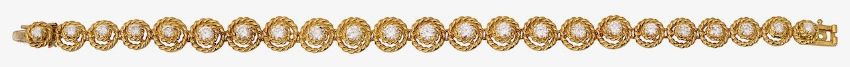 A diamond-set flexible link bracelet by Garrardthe graduated line of 18ct yellow gold wirework clusters, each centrally-set with a brilliant-cut diamond, concealed box clasp, signed 'G&Co', London import mark; leather gilt tooled case for Garrard length 18.5 cm, 20.1gCondition: Overall condition very good. A smart piece.Diamonds: all bright, with an estimated total spread weight of approximately 3.00- 3.50cts