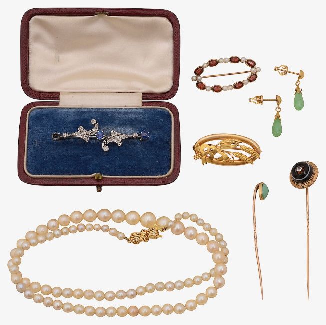 9ct gold garnet and pearl set brooch, oval garnets bezel set between pearls to 9ct gold mount, stamped with London hallmarks; sapphire and diamond set bar brooch; a string of pearls (untested), of graduating form with a 9ct gold clasp in the shape of a bow; an open work brooch with wheat design, indistinctly stamped "15ct"; a banded agate stick pin; a turquoise set stick pin and a pair of green gem drop pendants, stamped "18" to backs (qty)