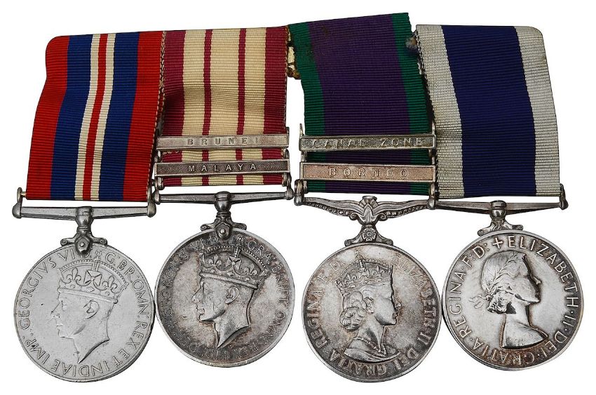 formed of 1939-45 war medal, Naval General Service 1915-62 medal G.VI.R with two clasps, Brunei and Malaya, General Service Medal 1962-2007, E.II.R, with two clasps Canal Zone and Borneo and Royal Navy Long Service and Good Conduct E.II.R medal, on ribbons