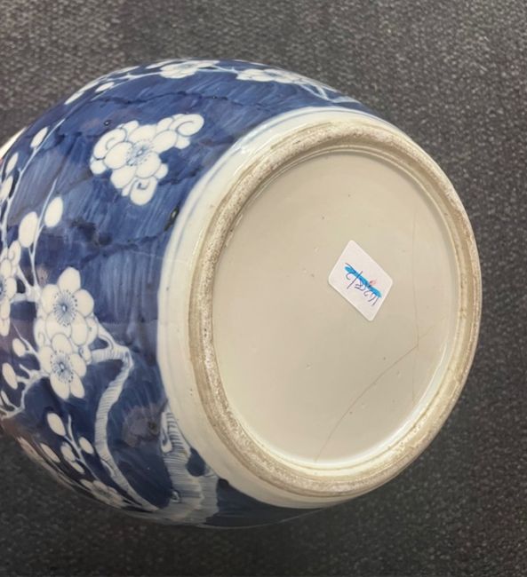 of tapering bulbous boy with lipped rim decorated with flowering prunus branches on a cracked ice ground