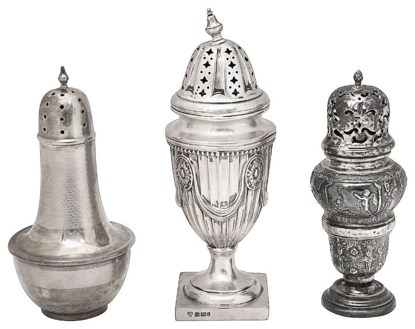 A late Victorian Neoclassical sugar caster, a Hanau caster and another