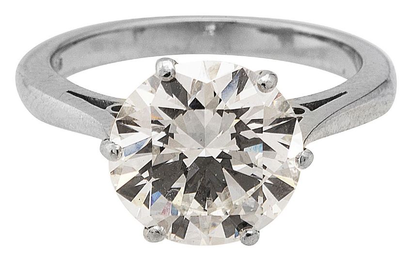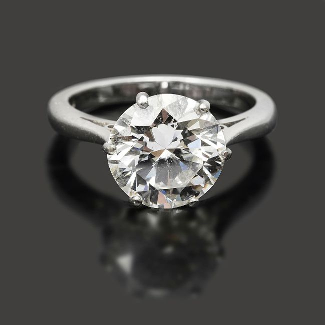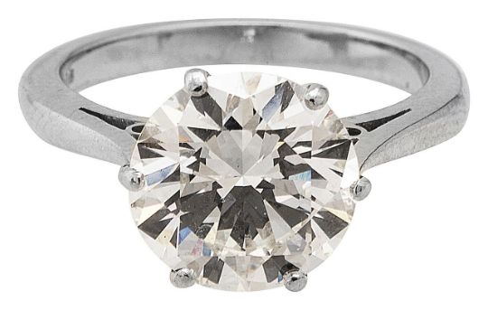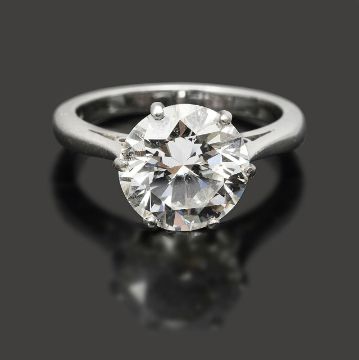 the brilliant-cut diamond weighing 3.12cts, claw-set to the plain tapering platinum shank, London hallmark