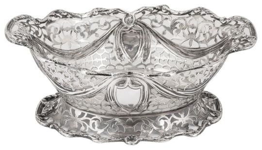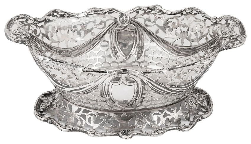 oval form pierced with foliate scrolls, vacant shield shaped reserves and draped swags with raised scroll border on a spreading foot