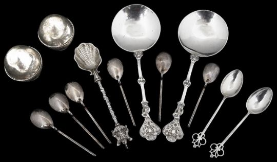 comprising a pair of late Victorian serving spoons, London, 1898, William Hutton & Sons Ltd in 17th century style with wide circular bowls and cast figural handles with trefoil terminals, a pair of egg cups and covers, Sheffield, 1978, C S of ovoid plain form geometric border on a foliate cast foot rim, a cast Salters Company spoon with shell bowl and coat of arms terminal, Sheffield, 1927, J.W &T, a set of six Roman design coffee spoons, Birmingham, 1964, William Suckling, (qty)