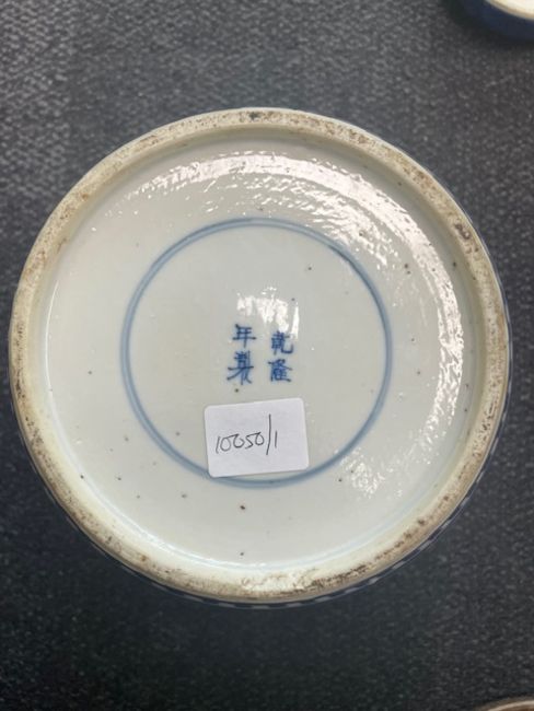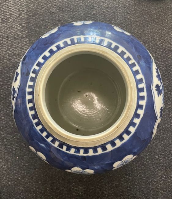 decorated with shaped reserves containing vases of flowers on stands and other precious objects, against a cracked ice and prunus blossom ground, four character Qianlong mark