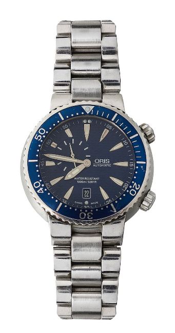 circular blue wave with raised silver hour dagger markers with luminous inserts, subsidiary seconds dial between 9 and 12 o'clock, outer seconds in white, blue enamel fluted rotating bezel with tachymeter scale, stainless steel bracelet with deployment clasp signed Oris.