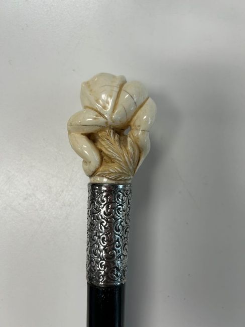 An Edwardian novelty walking canethe Japanese carved ivory pommel in the from of a frog with glass eyes, foliate scroll embossed collar with vacant shield reserve, ebonised tapering shaftlength 89 cm.Condition: Hairline to frog, chips and knocks to stem otherwise fair IMPORTANT NOTEThis item has been registered as exempt from the UK Ivory Act 2018. Ivory declaration submission number reference: T57E6VPX