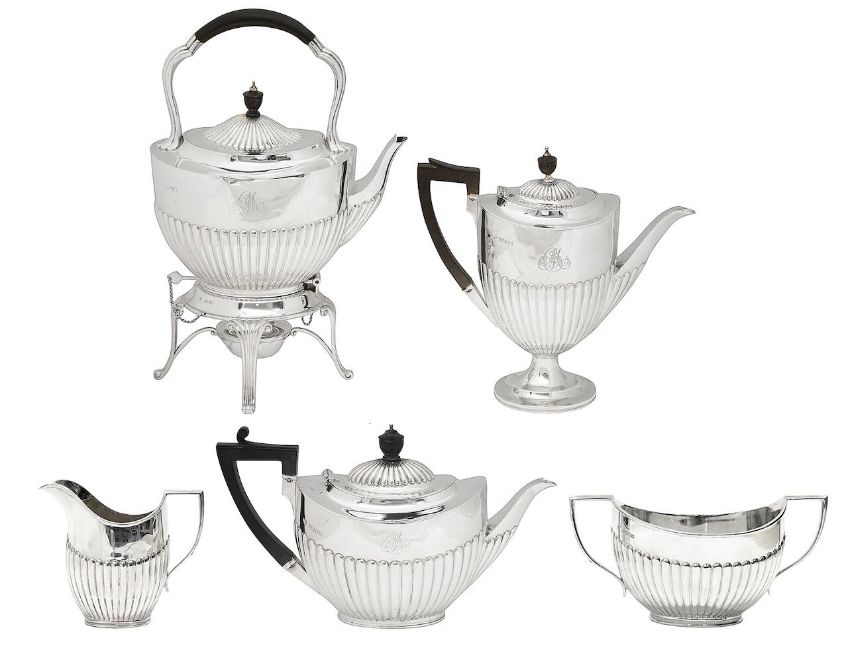 comprising of oval tapering half fluted form, comprising teapot, pedestal coffee pot and spirit kettle on stand with burner fitted with ebonised handles and finials, a twin handled sugar basin and a cream jug, initialled, stamped Elkington & Co Ltd Silversmiths 22 Regent St London (5)