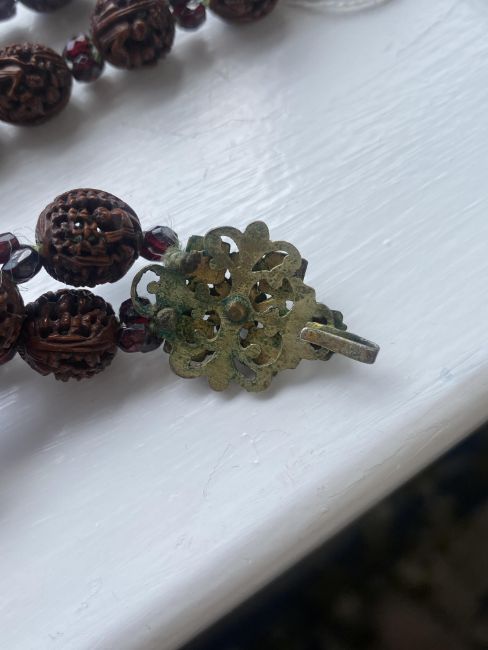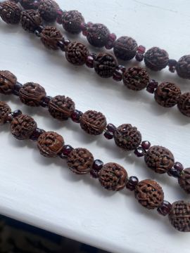 carved Heido nuts, set between faceted garnet beads, associated gilt clasp, set with coloured gems