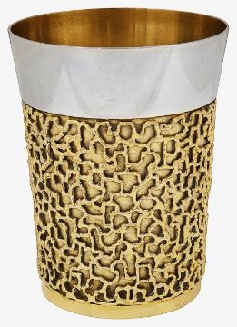 of tapering form, with a broad polished rim over a lower section with with applied pierced textured decoration on a matte ground, on a circular gilt foot, interior gilt