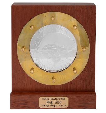 portrait of Elizabeth facing right, rev Moby Dick, mounted in a wood frame with brass porthole surround, bears brass plaque Cook Islands 2001 Moby Dick Mintage 600 pcs No. 473.
