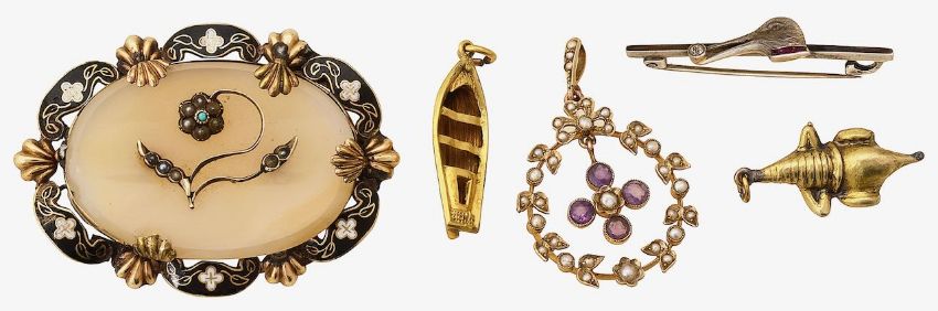 an Edwardian circular seed pearl and amethyst set pendant, in the style of a wreath, stamped "9c" to reverse; a floral chalcedony brooch, the oval chalcedony plaque applied with floral motive within a black enamel scalloped edge border; a Snipe bar brooch, featuring the head of a Snipe, holding a colourless gem in its beak, with a pink gem set collar; a boat charm and an imp charm (5)