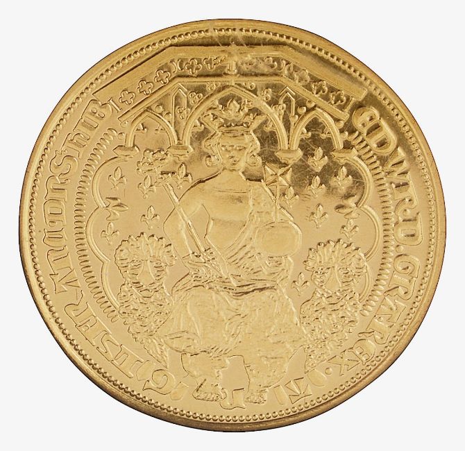 number 2318 of 5000 minted, year 1344, obverse side, representation of King Edward III of England on the throne, under a gothic portico decorated with fleur-de-lis. He is carrying a sceptre in his right hand and a orb in his left hand. He is surrounded by two leopards. Reverse side, royal cross within a quadriobe cantoned by four leopards
