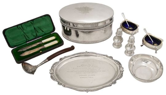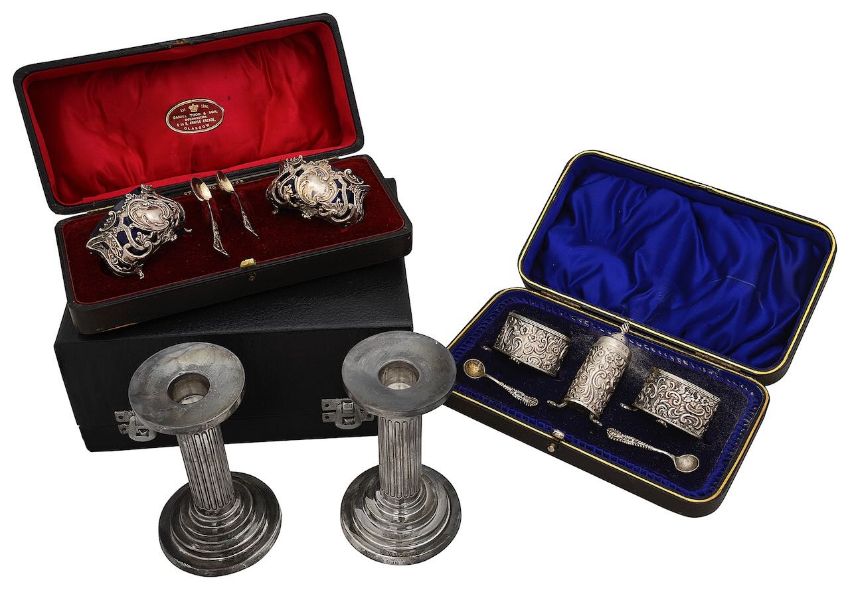 comprising a cased pair Indian of fluted dwarf column candlesticks on stepped weighted circular bases, stamped SIL, an Indian oval silver dish with presentation inscription, stamped SILVER, an Indian bowl stamped P silver, a cased three piece cruet set, Sheffield, 1897, Watson & Gillott, comprising a foliate embossed pepper pot and two open salts with blue glass liners and spoons, a cased pair of pierced open salts with blue glass liners and spoons, Birmingham, 1900, maker mark L.G, a pair of oblong bellied salts on legs with spoons, a a pair of ogee baluster form pepper pots, a cased pair of mother of pearl handled silver plated butter knives and an oval electroplated biscuit box engraved R, (qty)