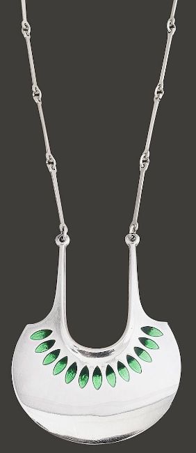 large semi-circular pendant, with light and dark green enamel leaf motifs, stamped to reverse "David-Andersen / Norway Sterling 925S", stamped with London import marks, suspended from an integral bar chain