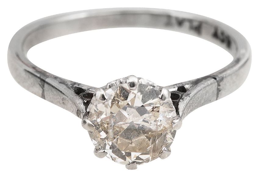 A diamond single stone ringthe old brilliant-cut diamond estimated to weigh approximately 1.00ct, coronet-set to the plain shank stamped '18ct PLAT' ring size N1/2, 3.0gCondition: K/L colour, PK clarity some fluorescence