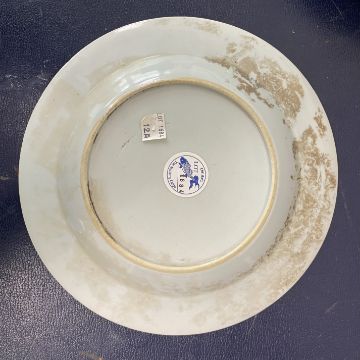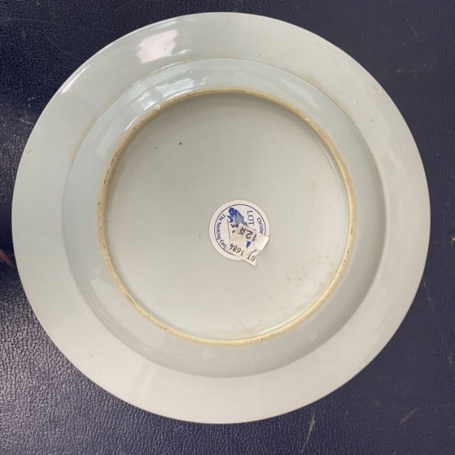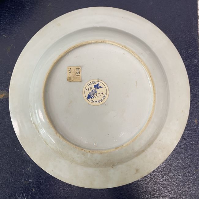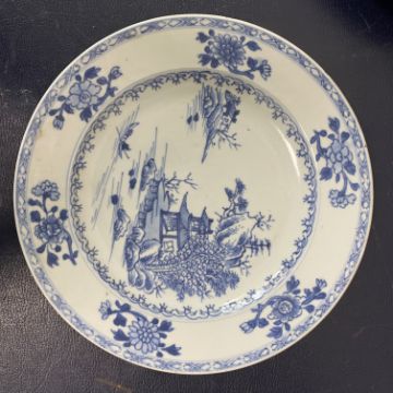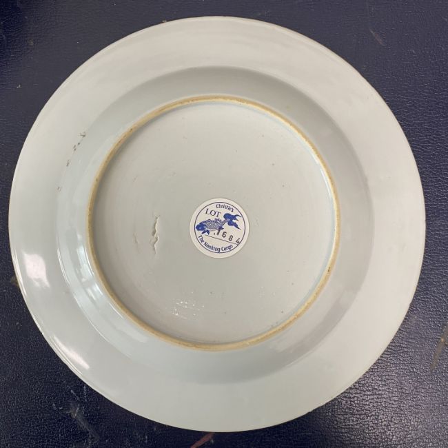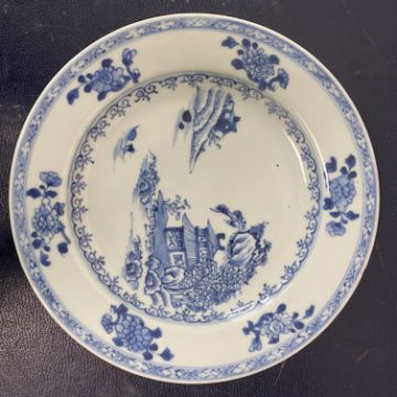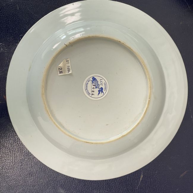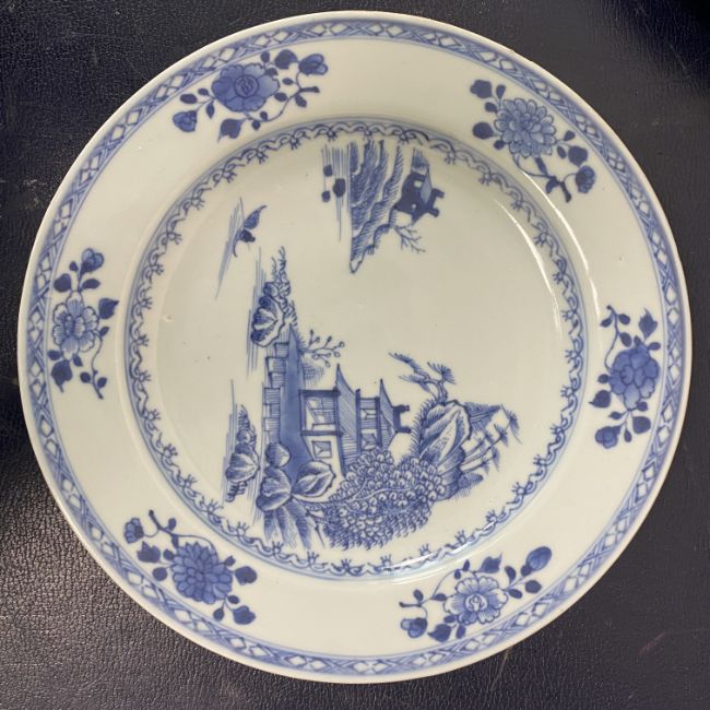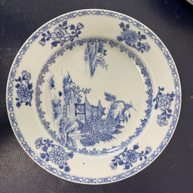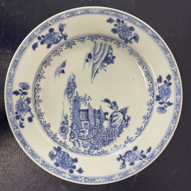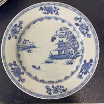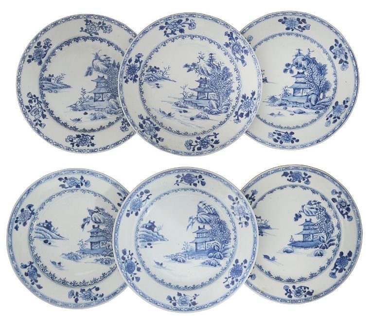 Nanking Cargo. A set of six Chinese export 'Boatman and six flower border' blue and white porcelain plates c.1750