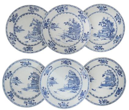 decorated in underglaze blue with watery landscape with pagodas, tress and figure in a boat, the border with six peony sprays, each bearing Christie's paper label ex lot 1684, (6)