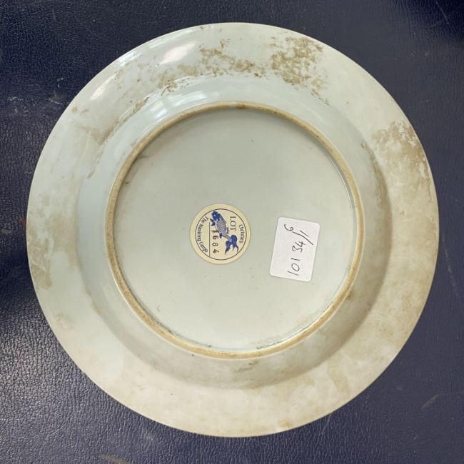 Condition: one very small fleabite chip to glaze rim on five plate. one plate three similar glaze chips. One plate with a couple. Otherwise in good condition